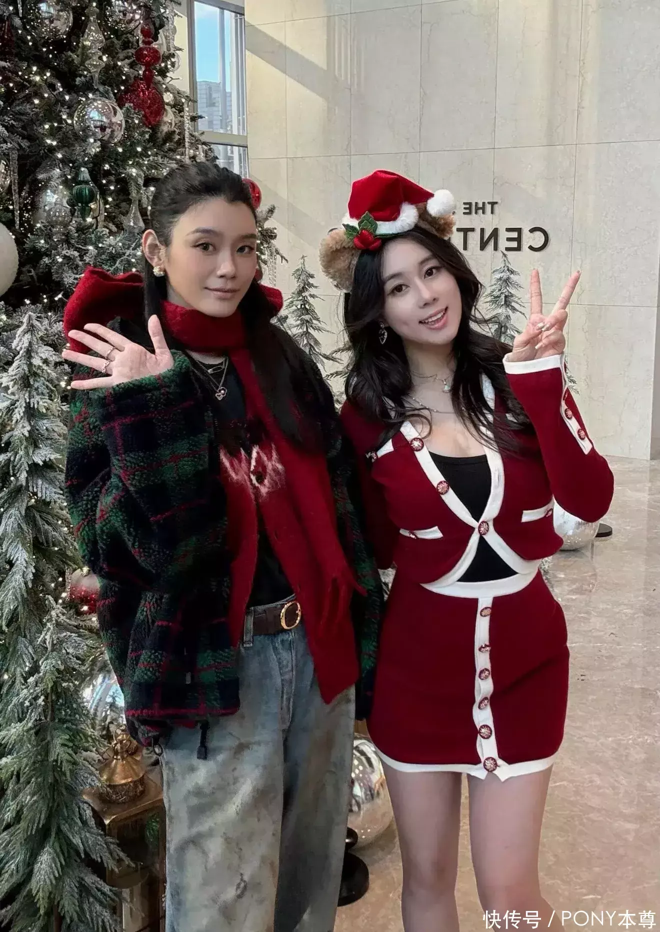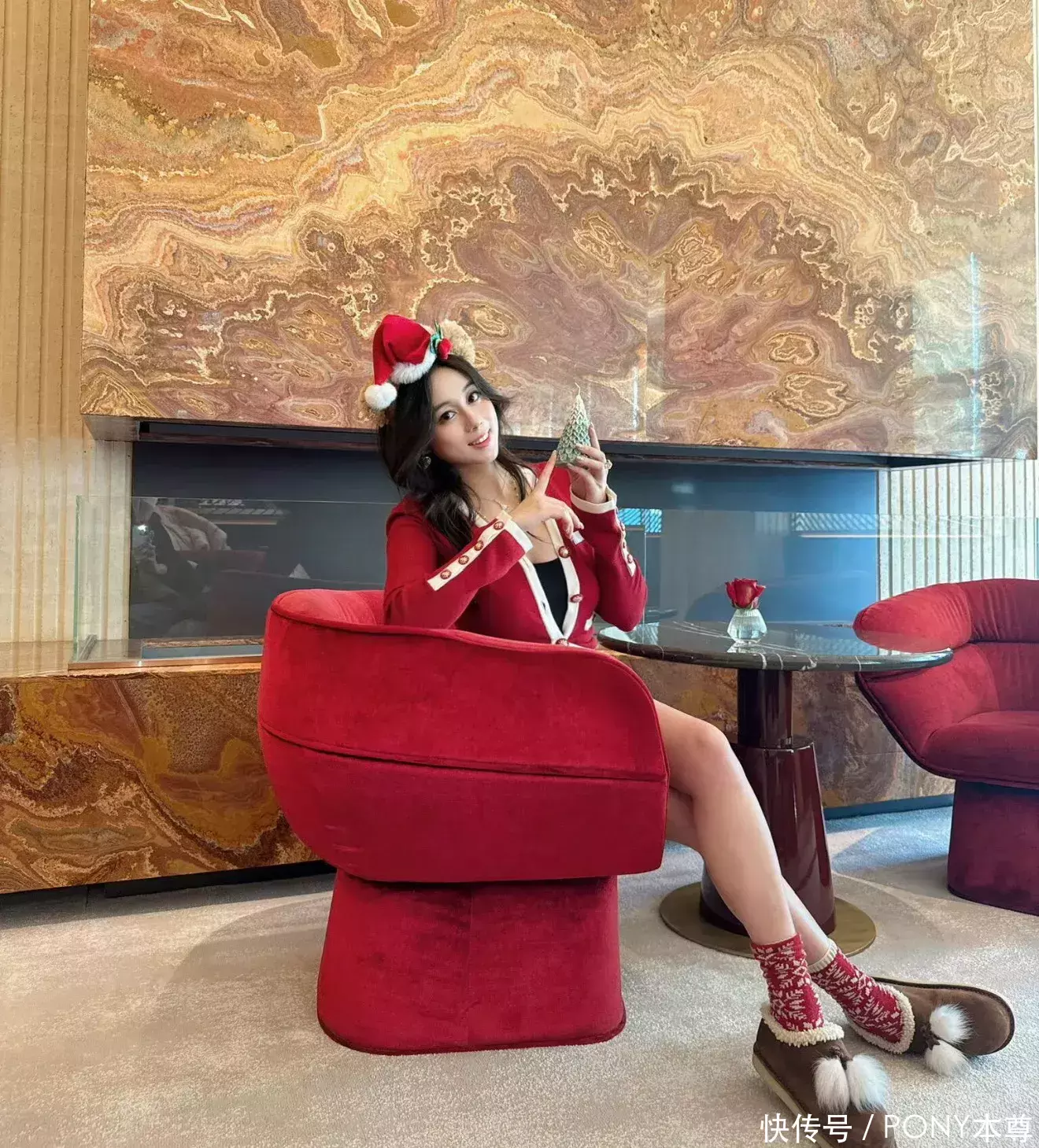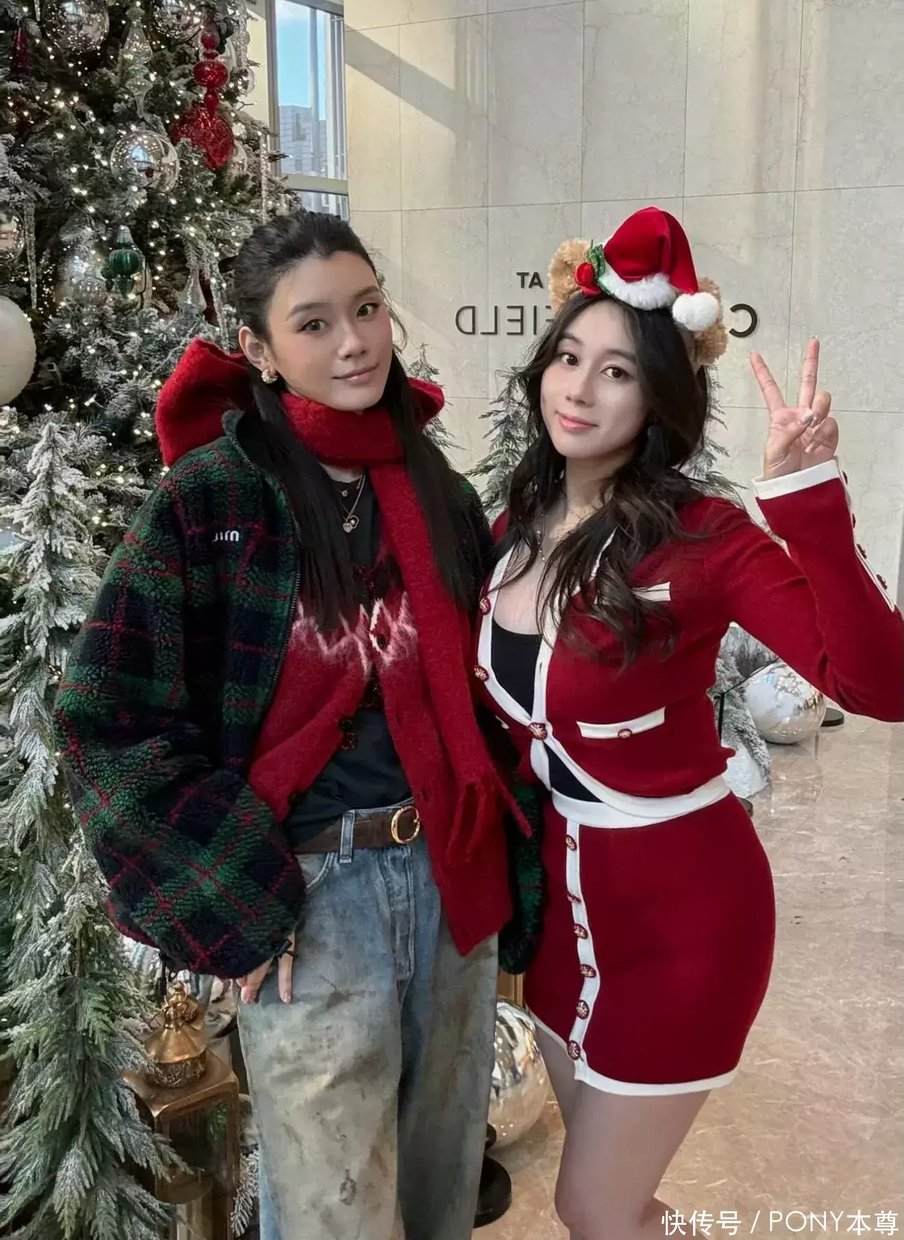 发型与配饰的选择更是点睛之笔,半扎发造型清爽干练,既露出精致的五官,又增添了几分少女感,搭配一条同色系红色围巾,不仅在色彩上形成呼应,更让整体造型的节日氛围愈发浓厚。