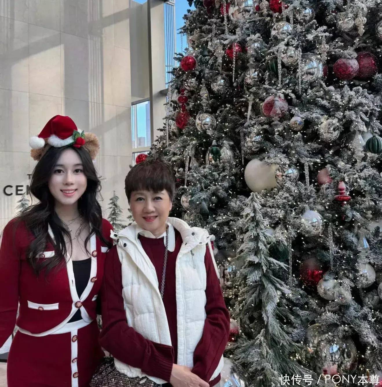 母女二人站在圣诞树前合照,节日氛围和家庭氛围拉满!